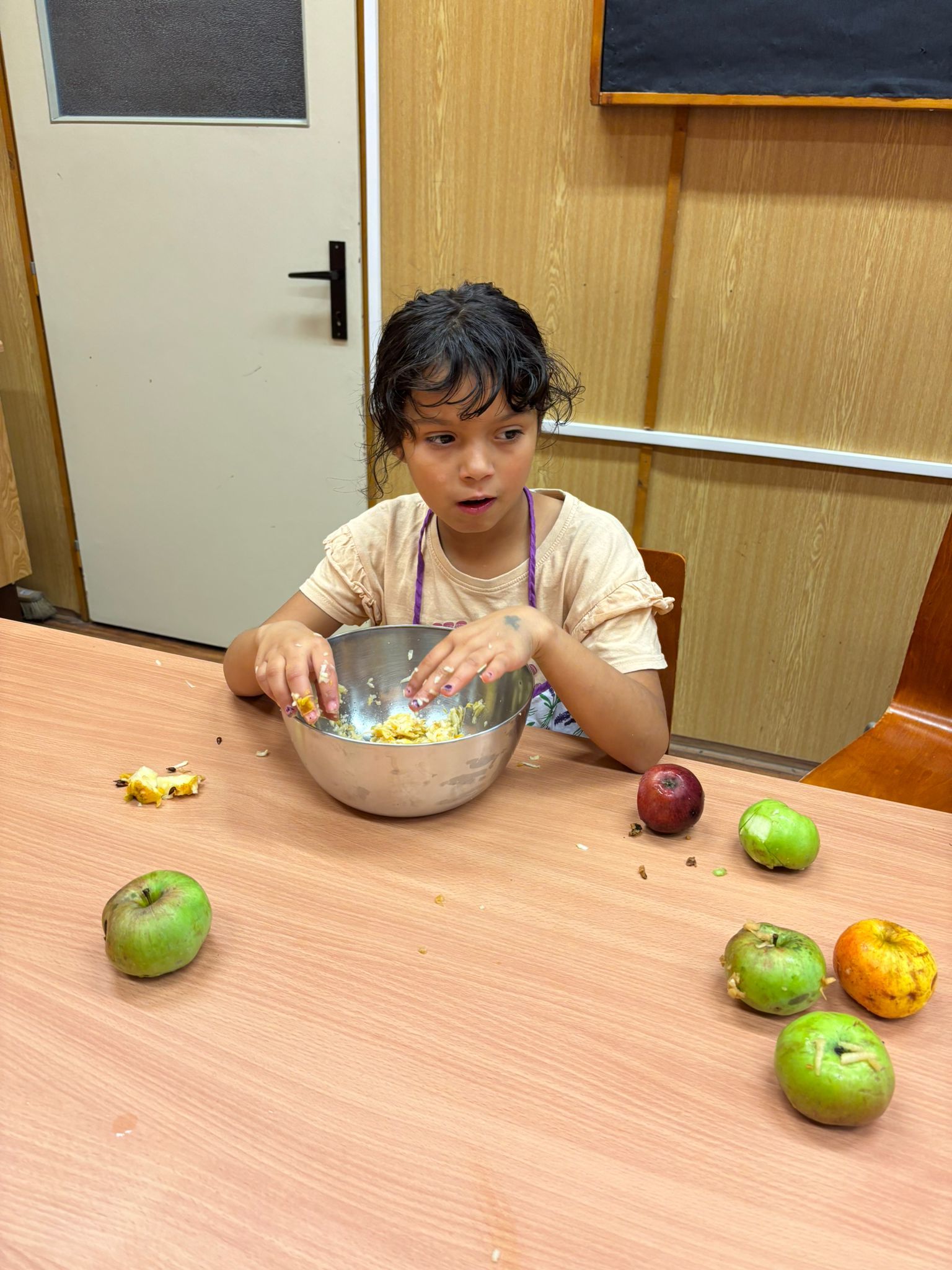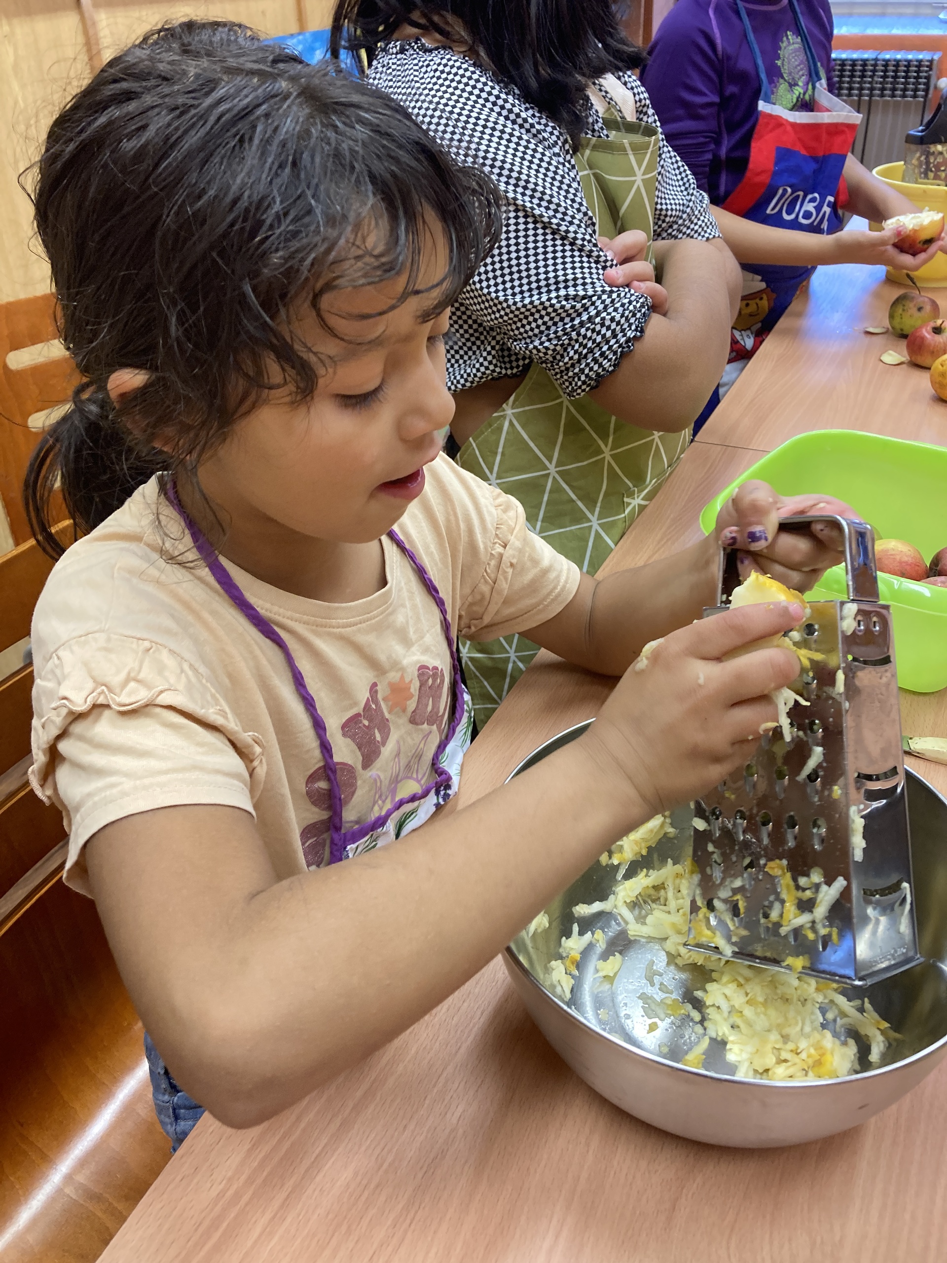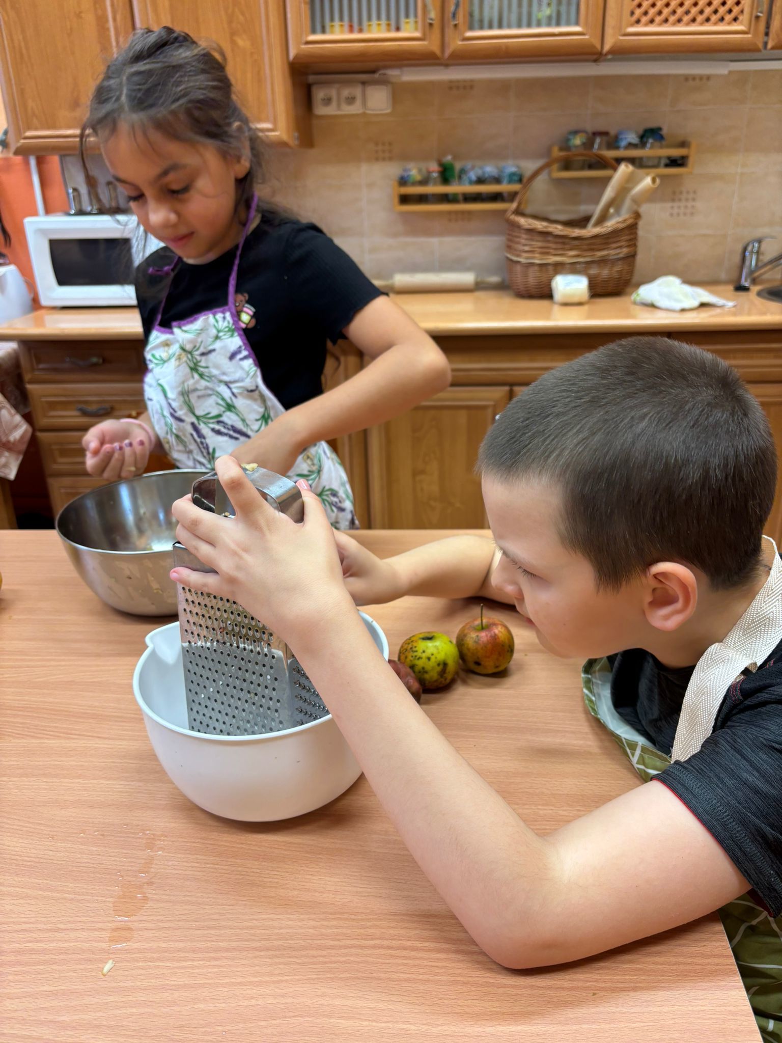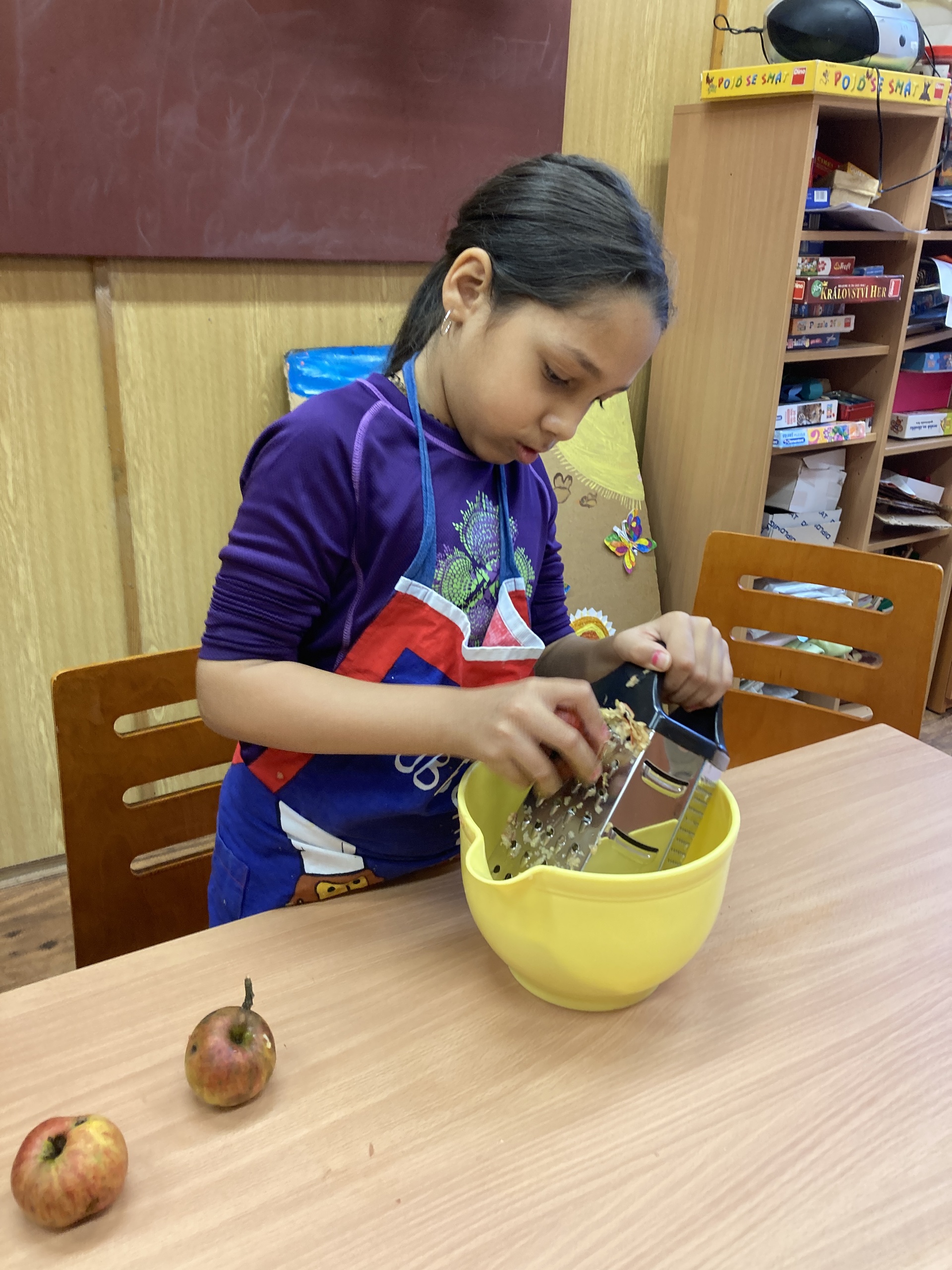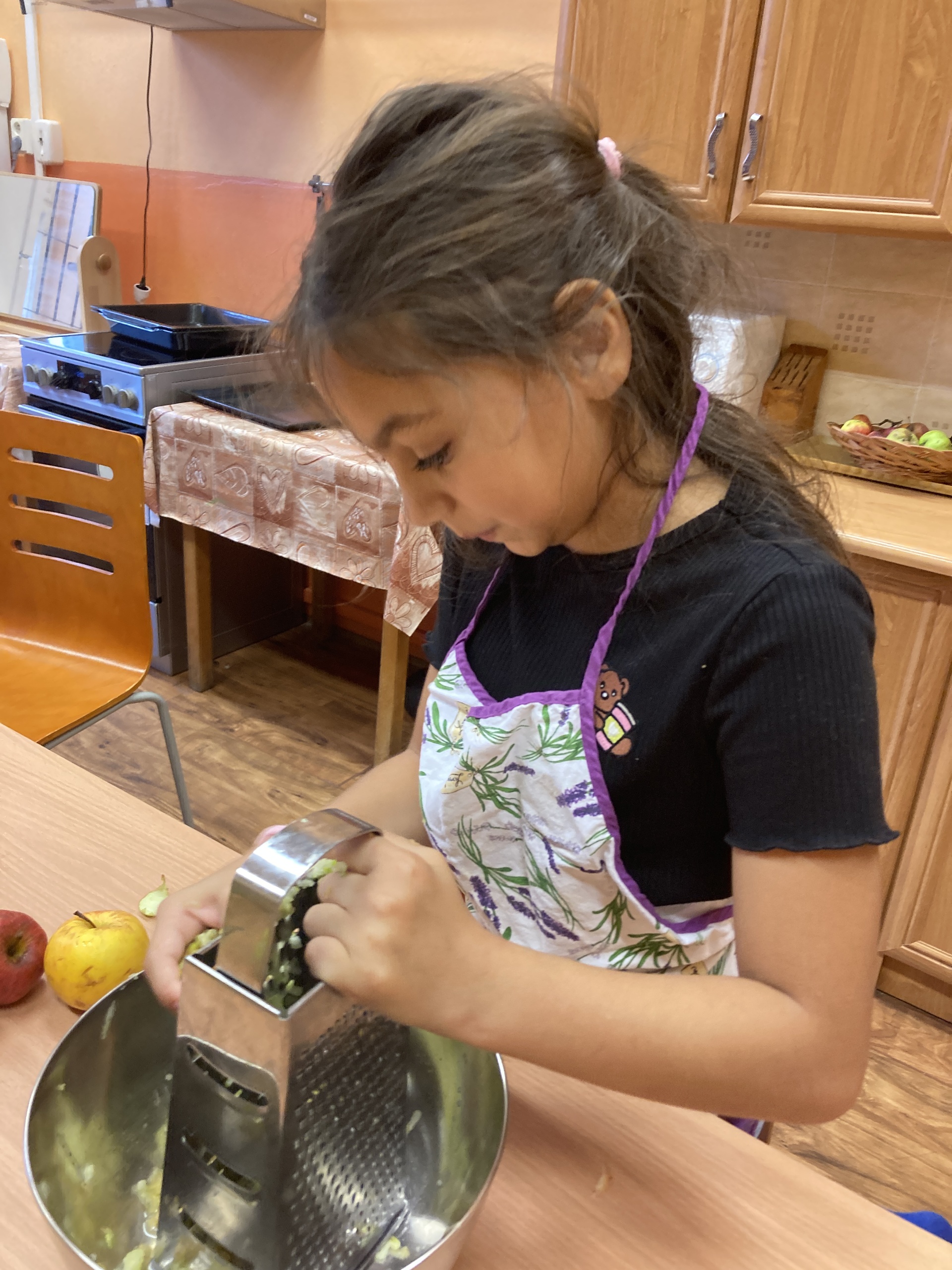 Na školní zahradě dozrála jablíčka. Je jich hodně, ale na jídlo moc dobrá nejsou. Ale takový štrúdl, ten z nich bude vynikající. Děti z třetího ročníku si nejdřív vyzkoušely, jak se taková jablíčka češou. A tak už dobře vědí, že na česání ovoce není potřeba hřeben. Pak si přečetly recept, aby věděly, jak mají postupovat. No a pak hurá do kuchyňky válet, strouhat, zavinovat a péct. Sladká vůně provoněla celou budovu, až se sliny sbíhaly. Tak rychle ještě malý teplý kousek ochutnat a zbytek nám zpříjemní druhý den.