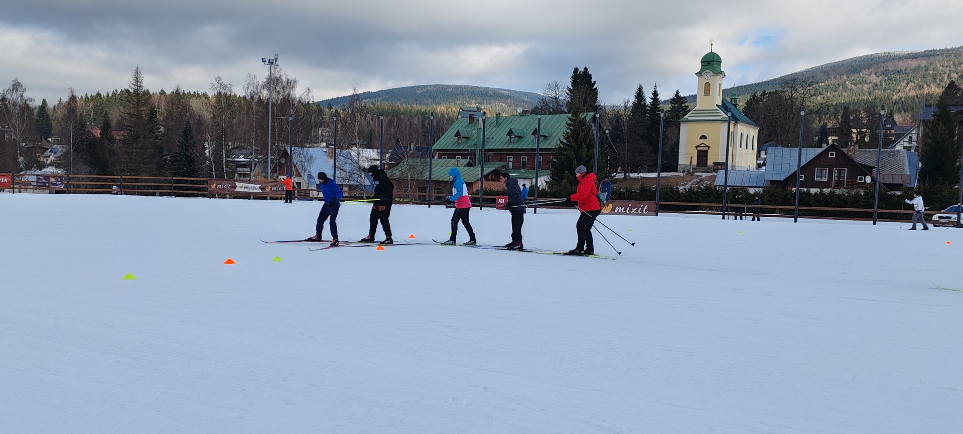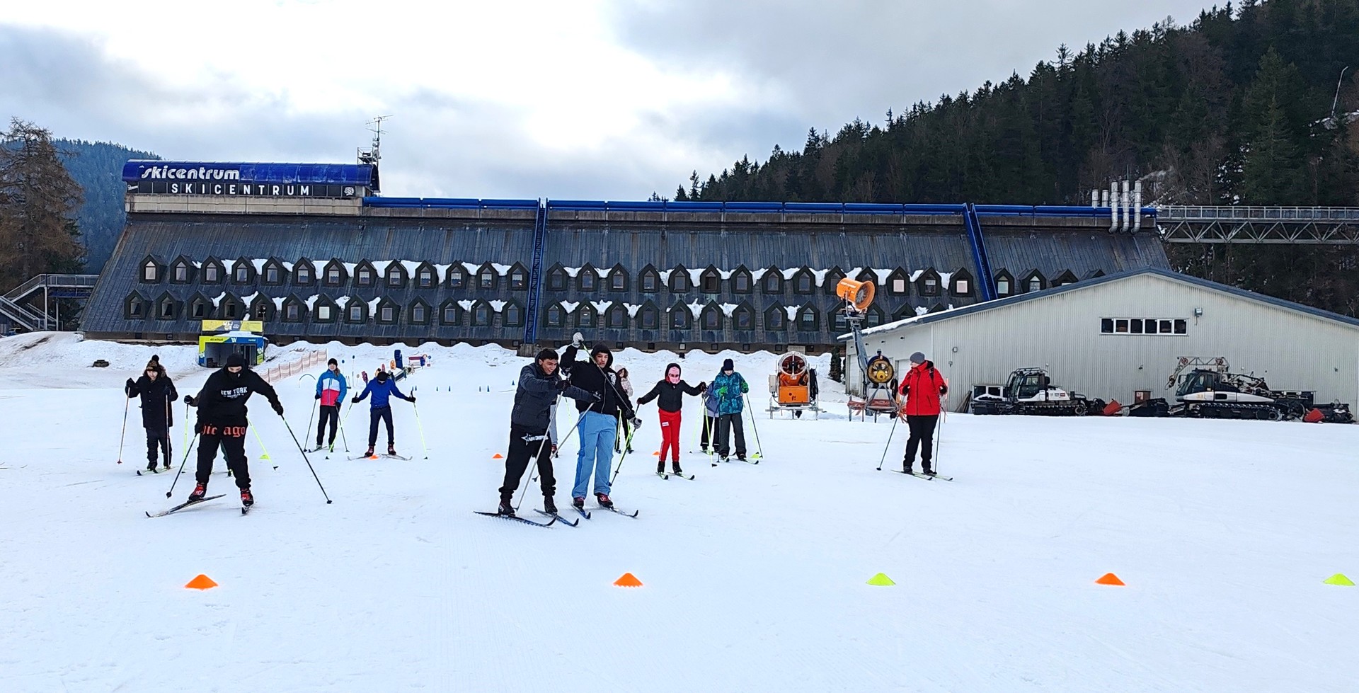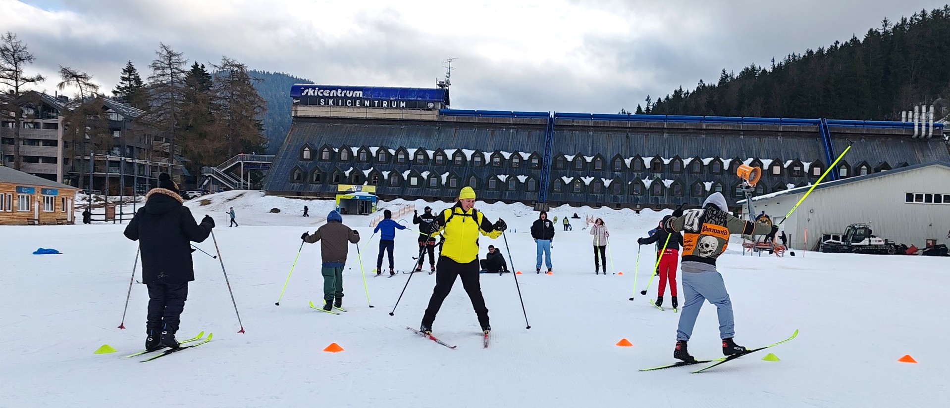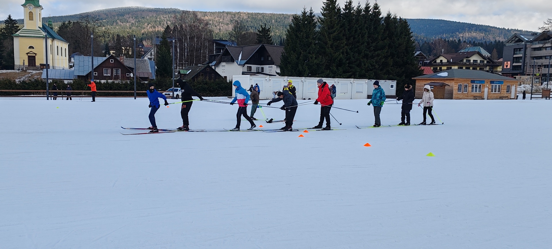 Běžecký stadion nám poskytl ideální zázemí pro zlepšování techniky, zábavné hry i odvážné sjezdy. Náš lyžařský výcvik pokračoval na vyhlášeném běžeckém stadionu v Harrachově. Trénování přímo pod slavnými mamutími můstky má svou nezaměnitelnou atmosféru a podmínky jsou zde pro výuku ideální. Program jsme zahájili trénováním běžecké techniky, kterou jsme prokládali různými hrami na sněhu. Nácvik sjezdů patřil k důležité, ale i zábavné součásti tréninku. Někteří se v rámci tréninku vydali podívat k dojezdu místní sjezdovky, která vede z Čerťáku dolů. Nejzdatnější, kteří po náročném dni měli ještě dostatek sil absolvovali vytyčenou trať na čas. Harrachovský stadion se znovu ukázal jako skvělé místo pro trénování a třeba se sem podíváme zase za rok.