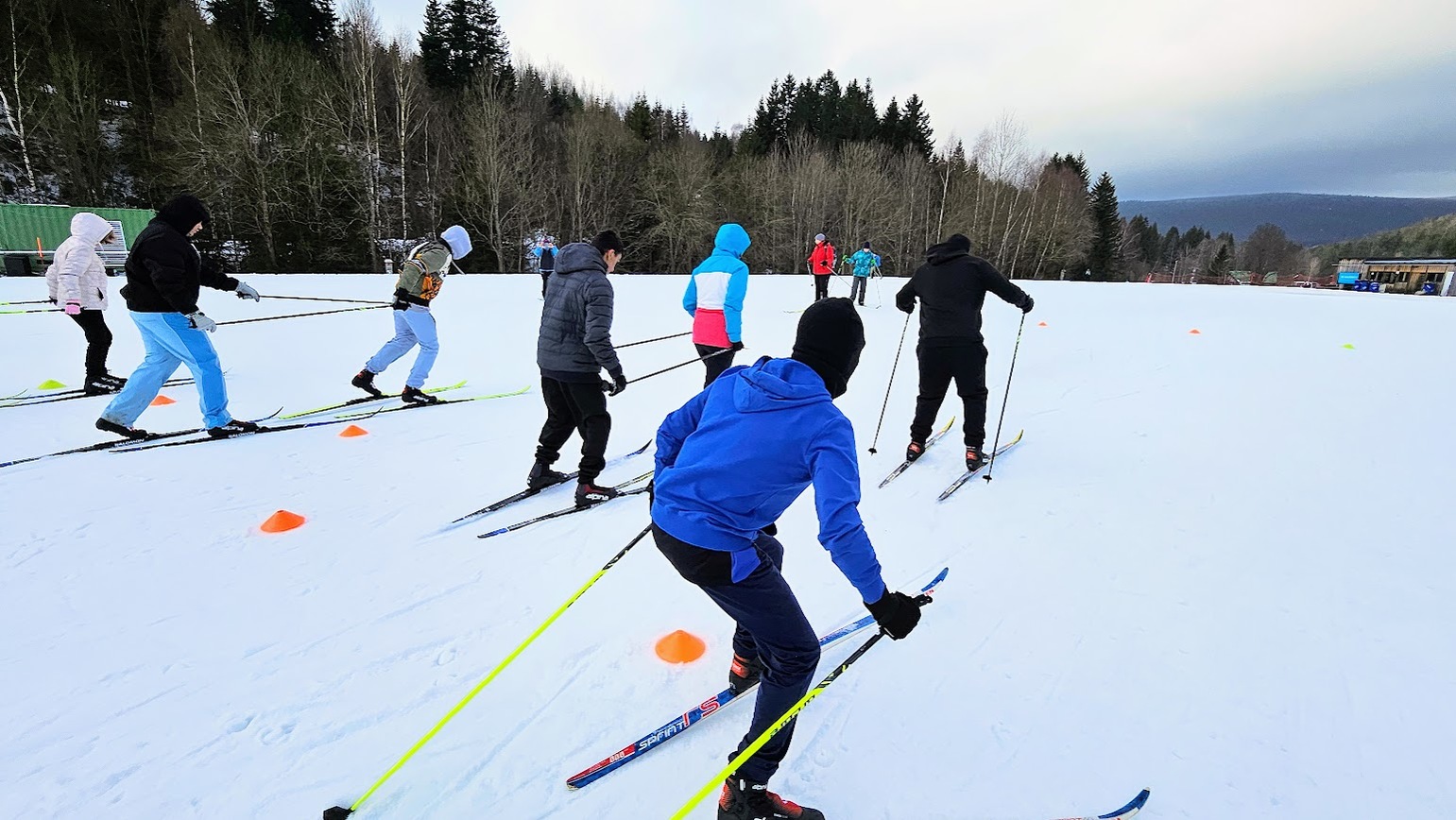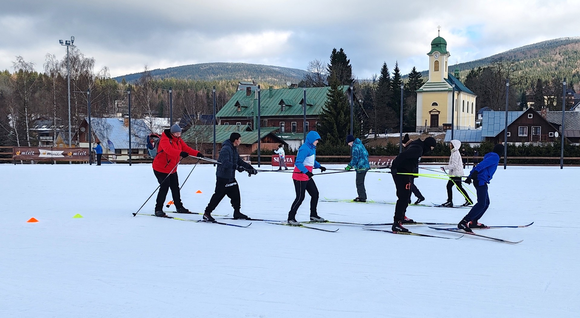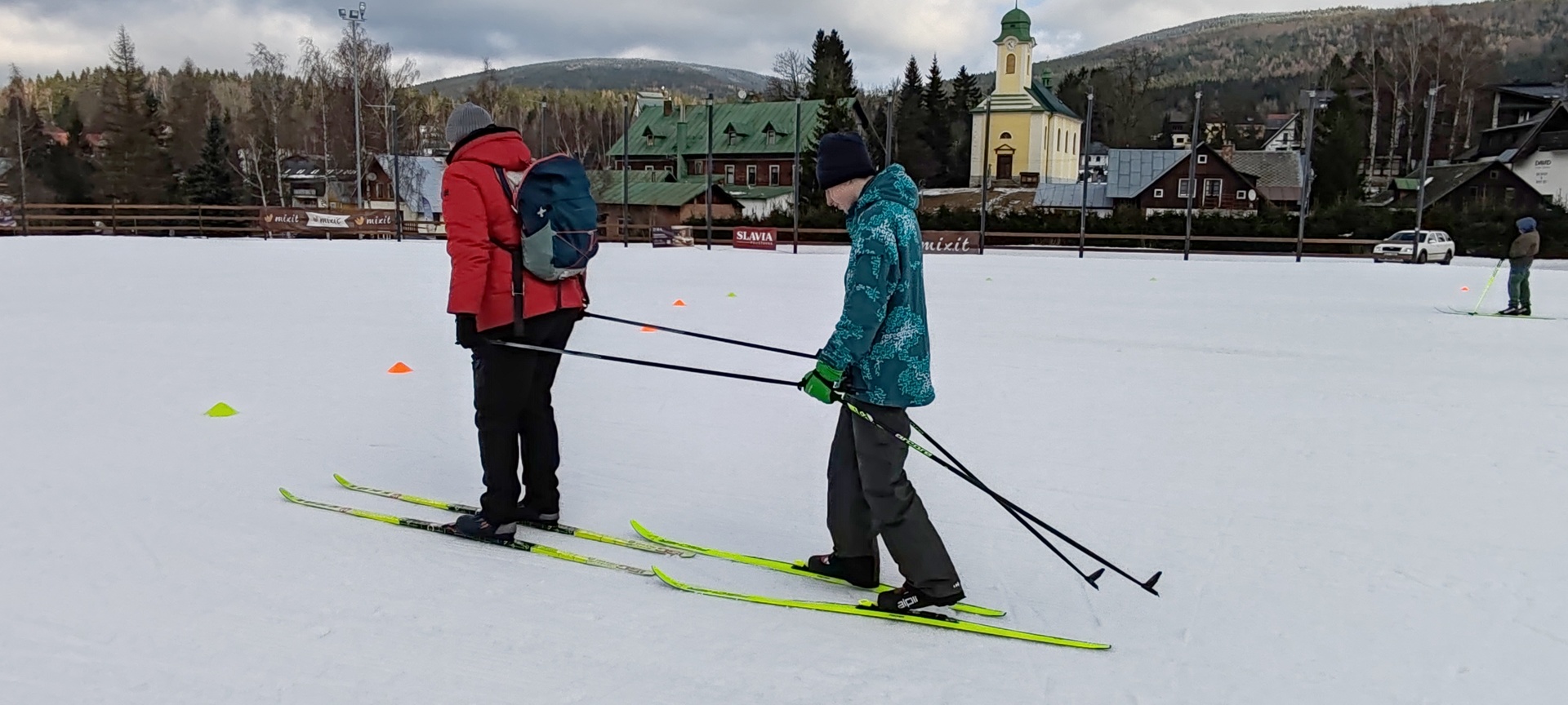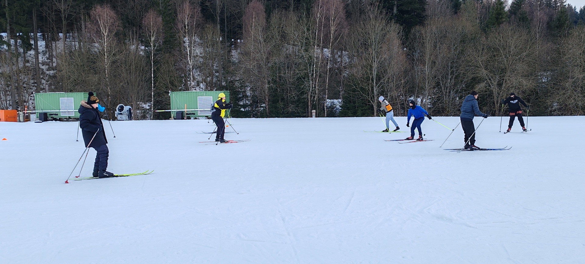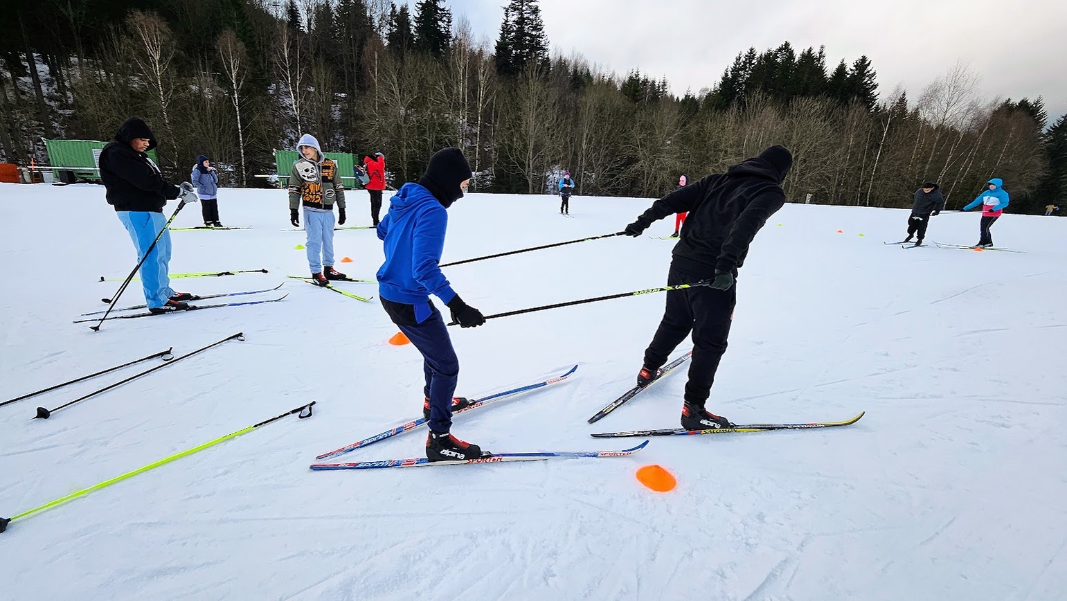 Běžecký stadion nám poskytl ideální zázemí pro zlepšování techniky, zábavné hry i odvážné sjezdy. Náš lyžařský výcvik pokračoval na vyhlášeném běžeckém stadionu v Harrachově. Trénování přímo pod slavnými mamutími můstky má svou nezaměnitelnou atmosféru a podmínky jsou zde pro výuku ideální. Program jsme zahájili trénováním běžecké techniky, kterou jsme prokládali různými hrami na sněhu. Nácvik sjezdů patřil k důležité, ale i zábavné součásti tréninku. Někteří se v rámci tréninku vydali podívat k dojezdu místní sjezdovky, která vede z Čerťáku dolů. Nejzdatnější, kteří po náročném dni měli ještě dostatek sil absolvovali vytyčenou trať na čas. Harrachovský stadion se znovu ukázal jako skvělé místo pro trénování a třeba se sem podíváme zase za rok.