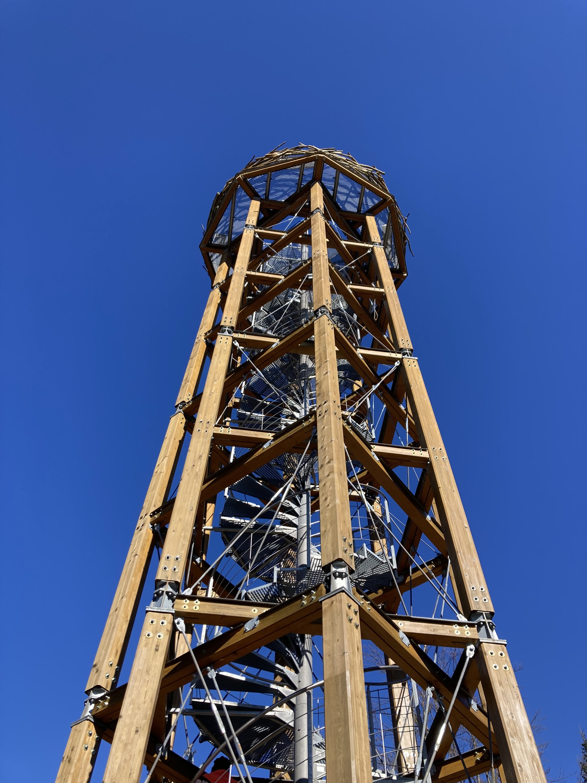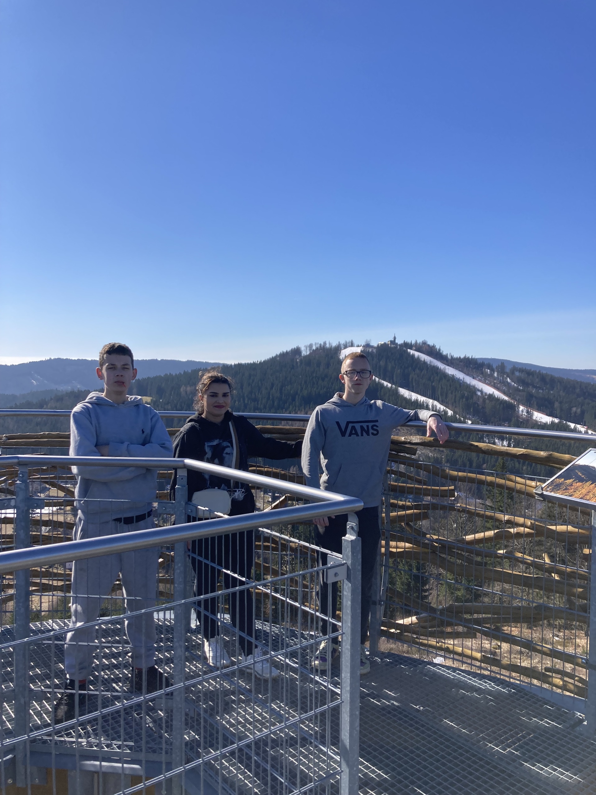 Po příchodu k rozhledně všichni vystoupali na její vrchol, odkud se otevřel krásný výhled na okolní hory a lesy.