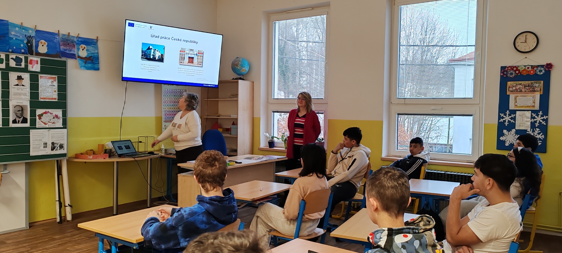 V pátek 23.1. proběhla na naší škole beseda s pracovníky Úřadu práce z Jablonce na Nisou, která byla určena žákům 8. a 9. ročníku. Tématem setkání byla volba povolání a další pracovní uplatnění po ukončení základní školy. Žáci se dozvěděli důležité informace o možnostech vzdělávání, o jednotlivých typech středních škol i o aktuální situaci na trhu práce. Pracovníci Úřadu práce žákům představili užitečné nástroje a portály, které jim mohou pomoci při rozhodování o budoucím povolání, ukázali jim jak rozpoznat své schopnosti a zájmy, na co se zaměřit při výběru oboru a kde hledat spolehlivé informace o povolání.