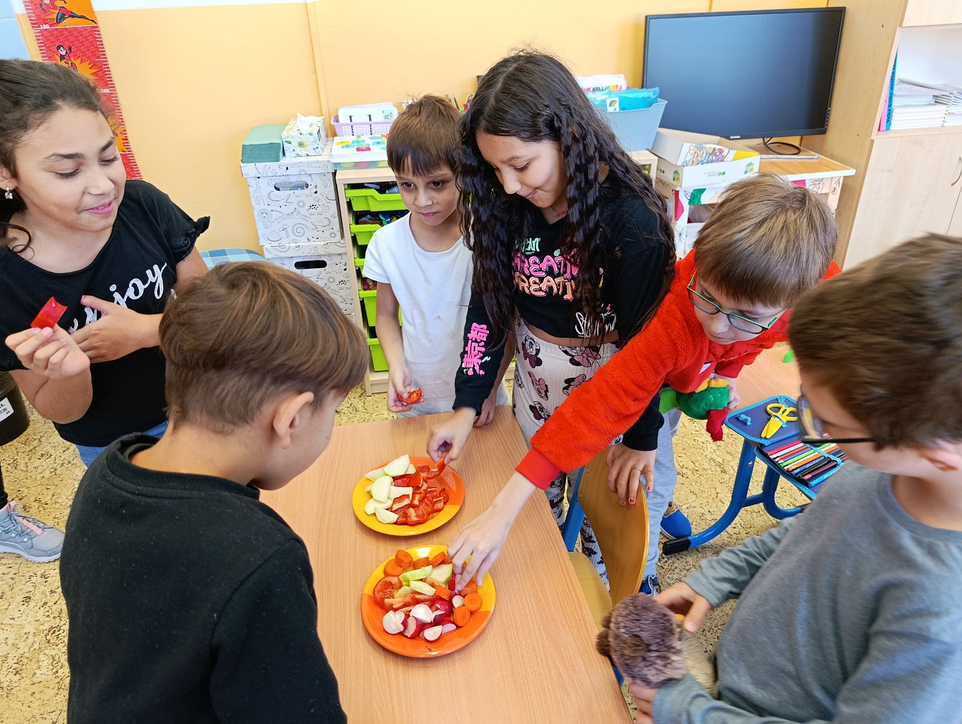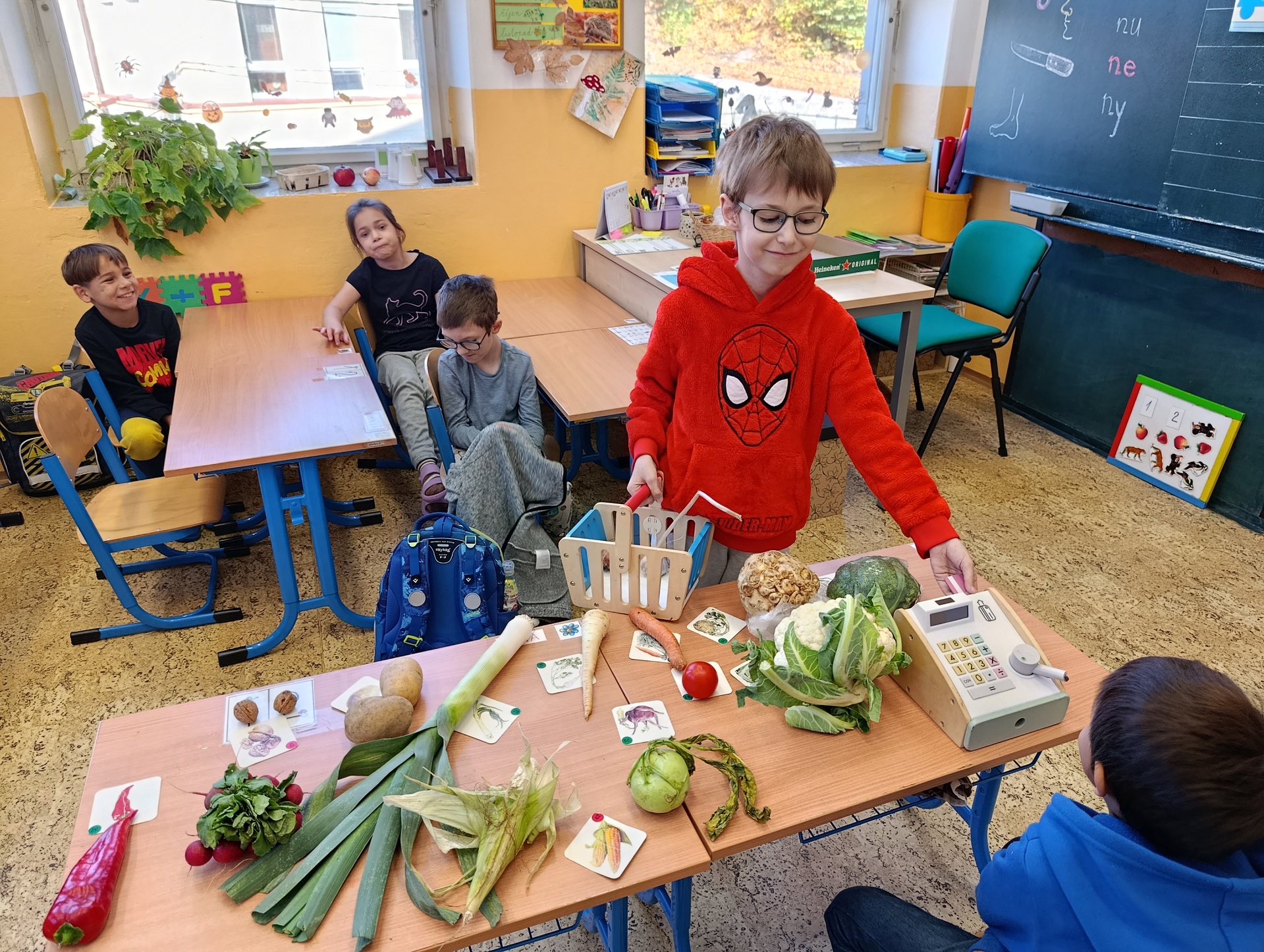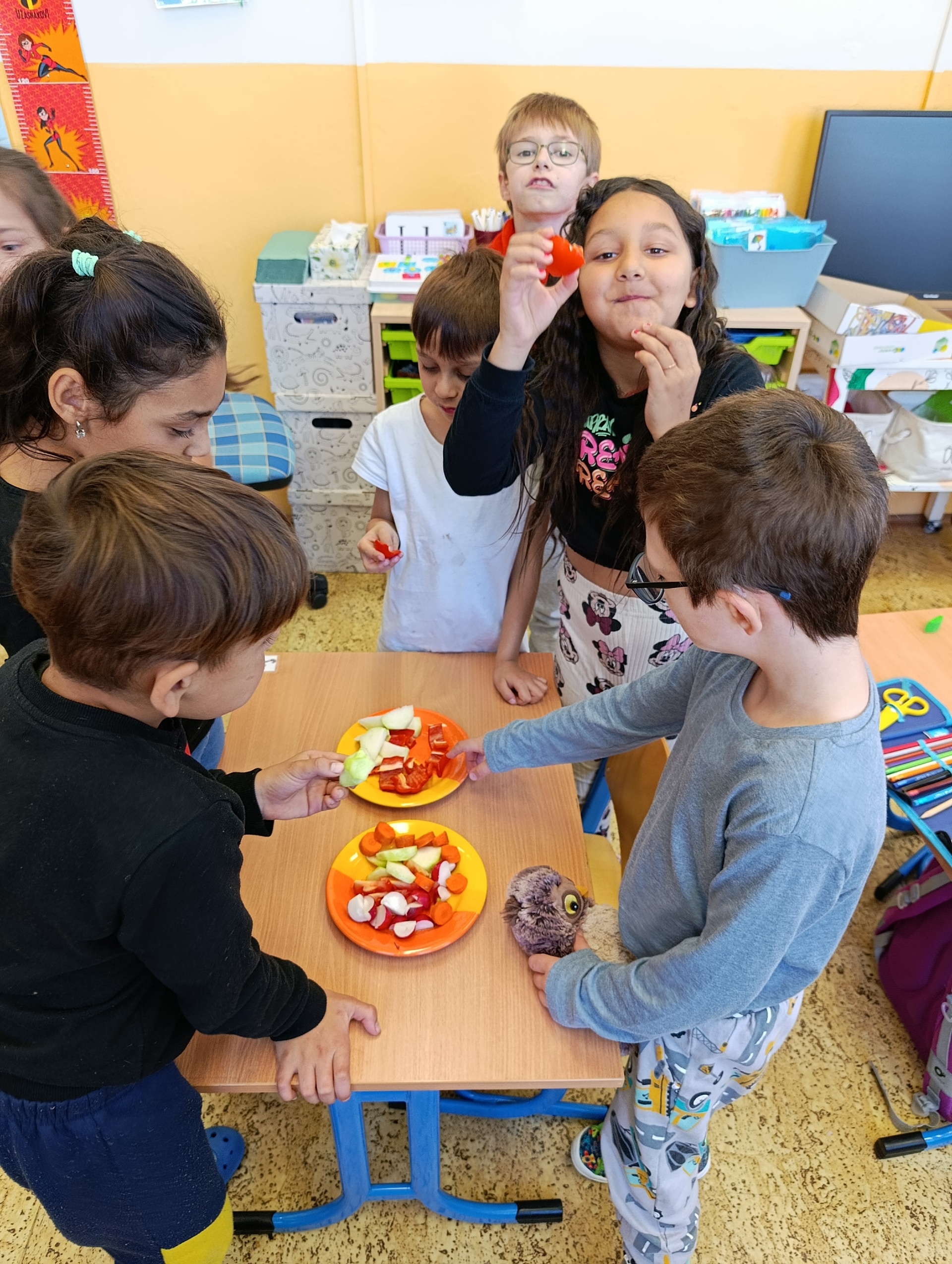 Obrázky jednotlivých druhů zeleniny děti pojmenovávaly a přiřazovaly je k té skutečné. To jim šlo opravdu dobře. Ale ještě větší zábava byla zahrát si na obchod se zeleninou a vystřídat se v rolích prodavače a kupujícího. Když jsme skončili s veselým nakupováním, přišel čas tu zdravou dobrotu sníst. Z talířků zmizela během chvilky.