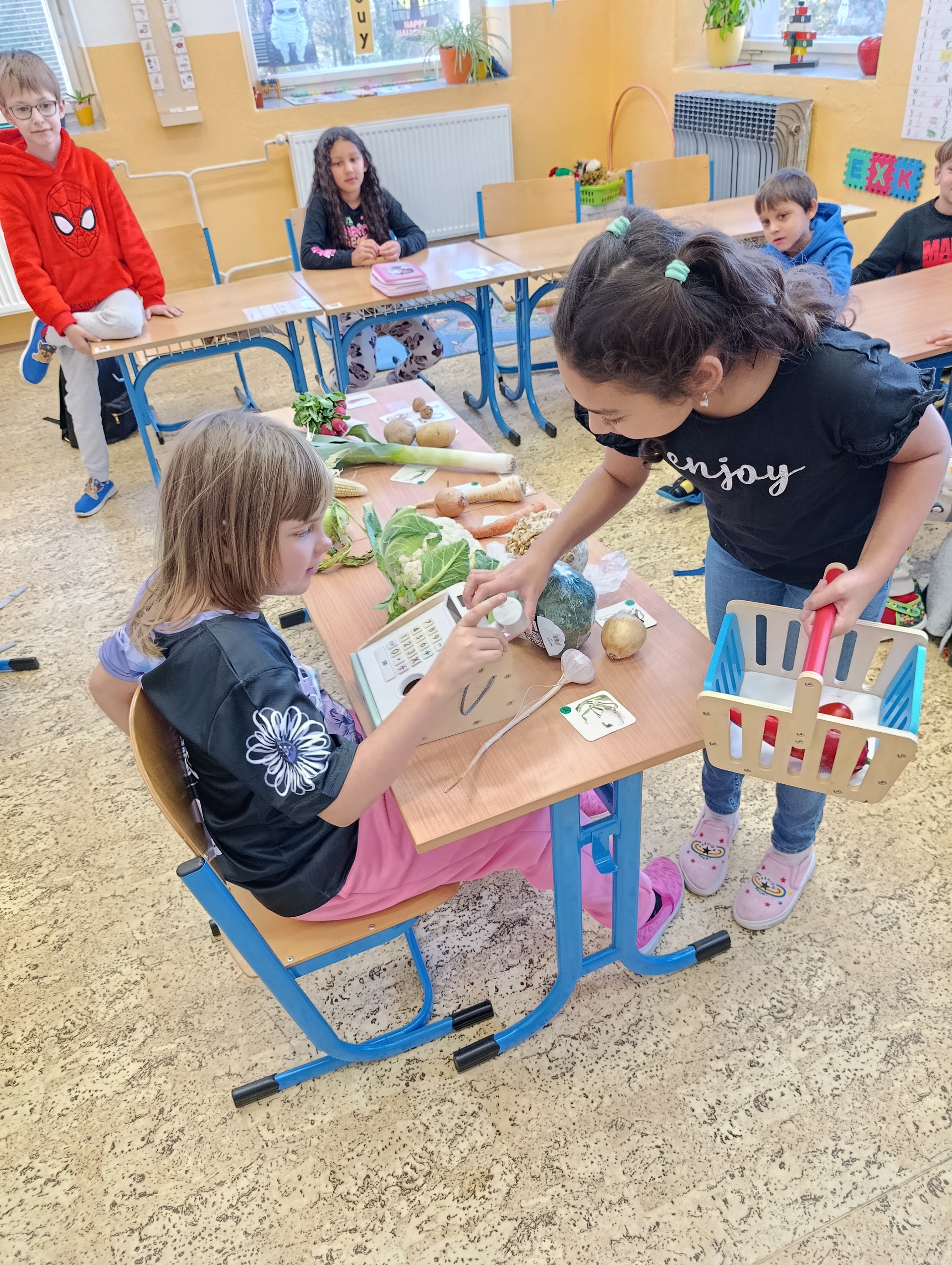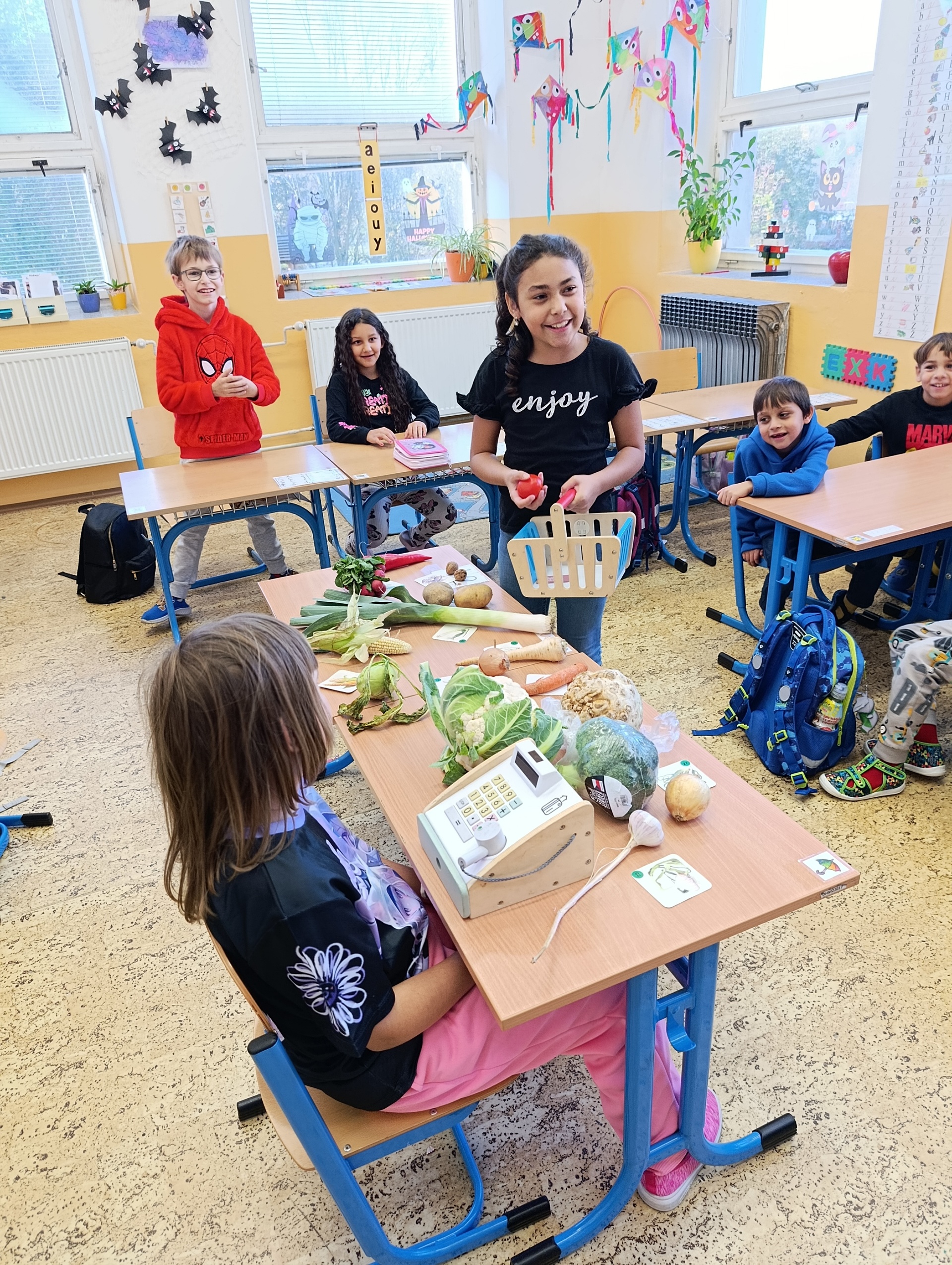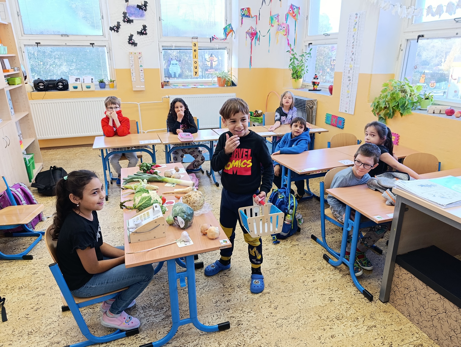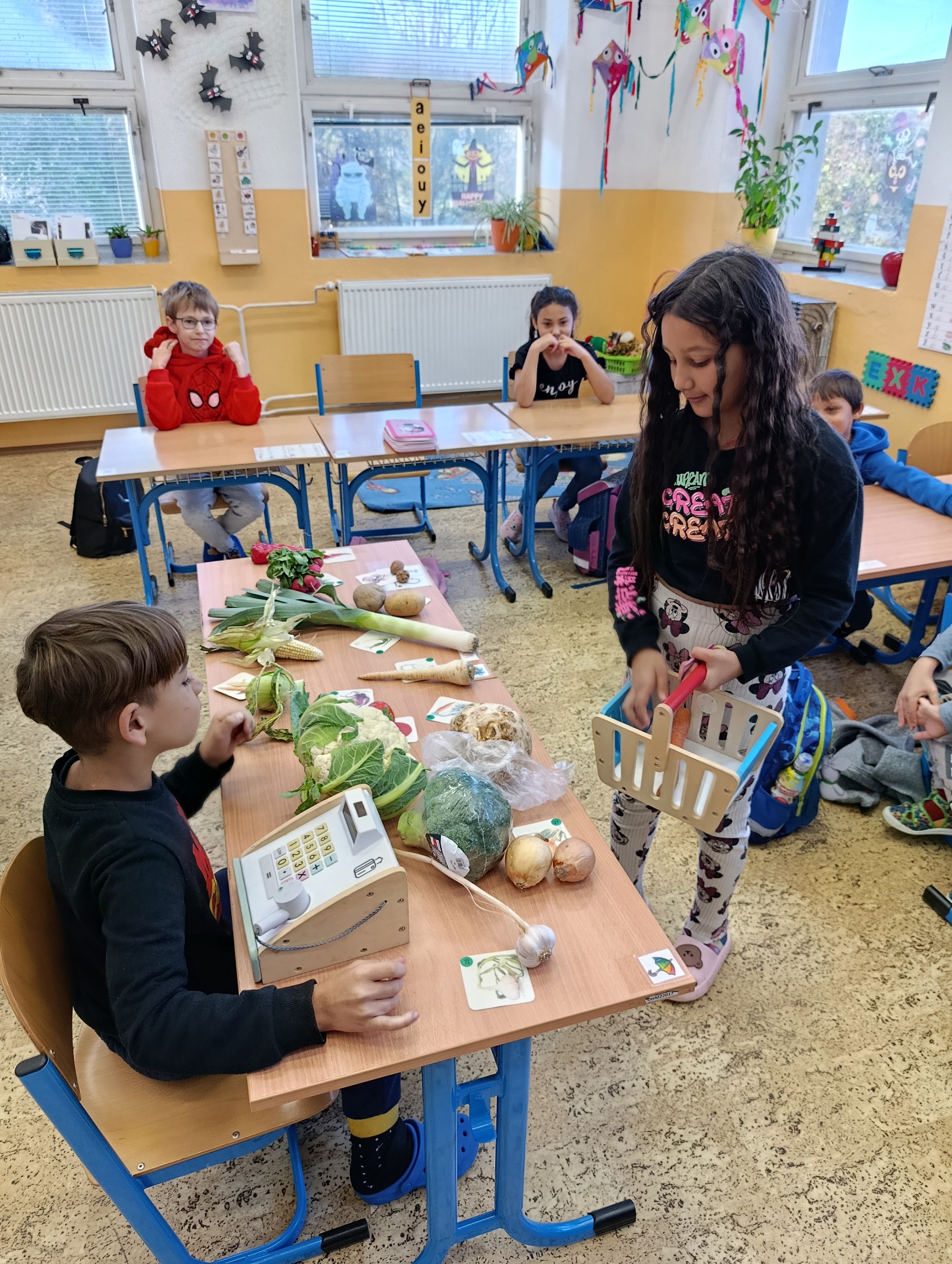 Obrázky jednotlivých druhů zeleniny děti pojmenovávaly a přiřazovaly je k té skutečné. To jim šlo opravdu dobře. Ale ještě větší zábava byla zahrát si na obchod se zeleninou a vystřídat se v rolích prodavače a kupujícího. Když jsme skončili s veselým nakupováním, přišel čas tu zdravou dobrotu sníst. Z talířků zmizela během chvilky.