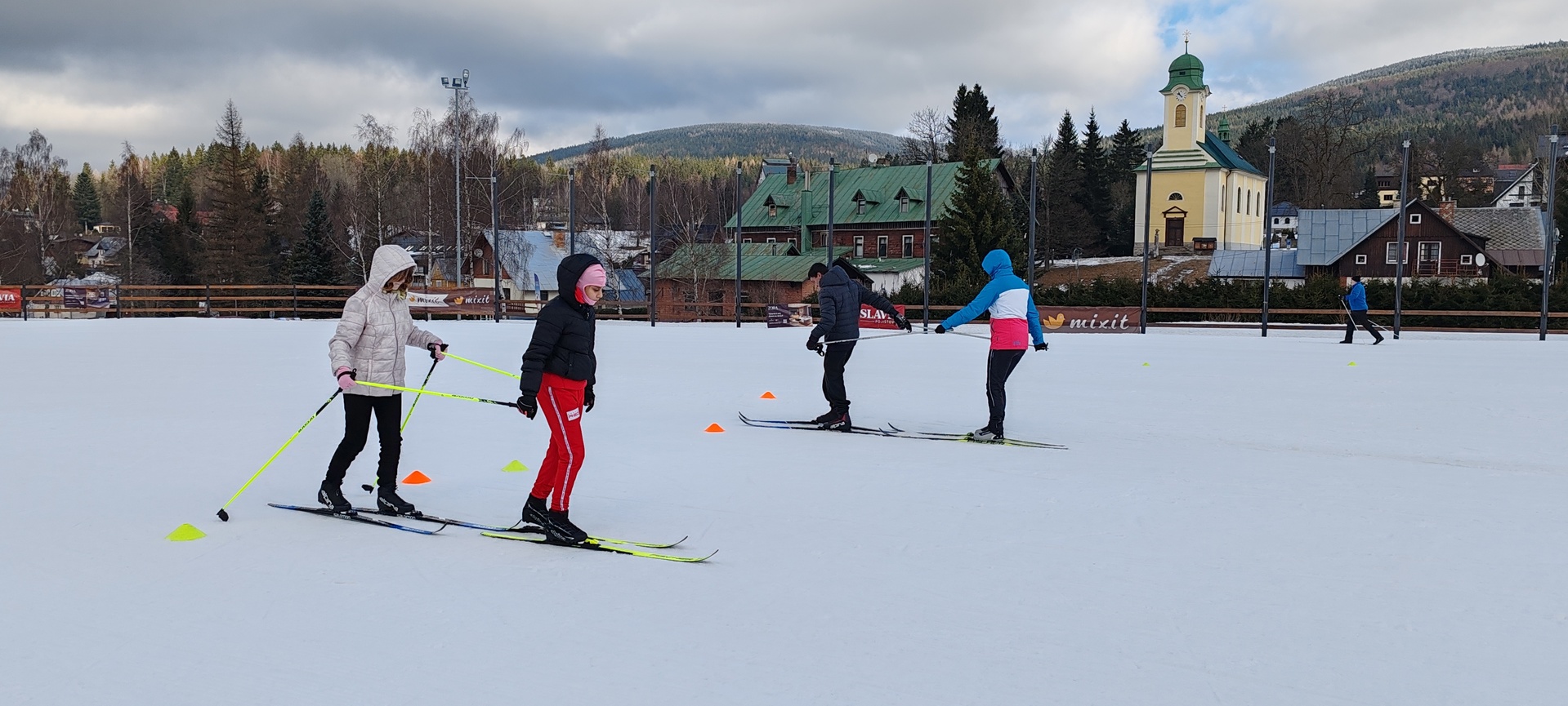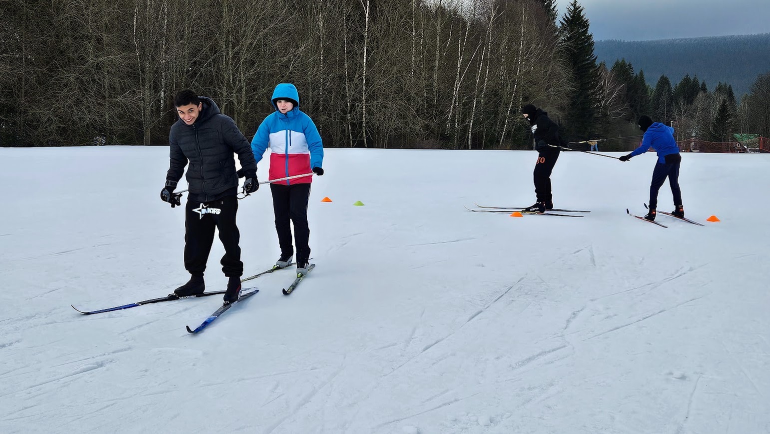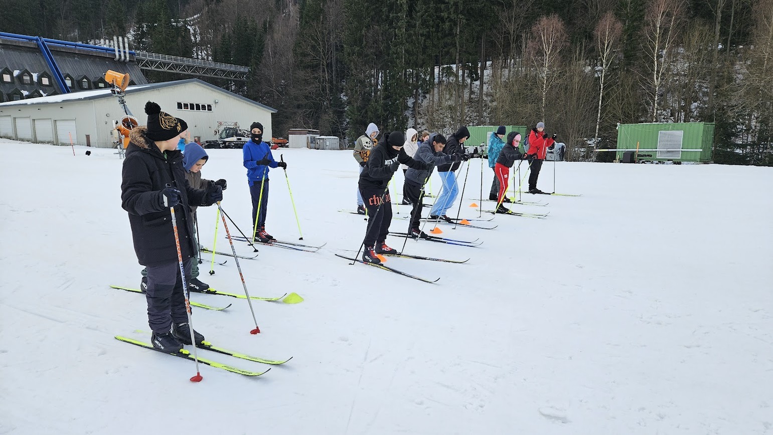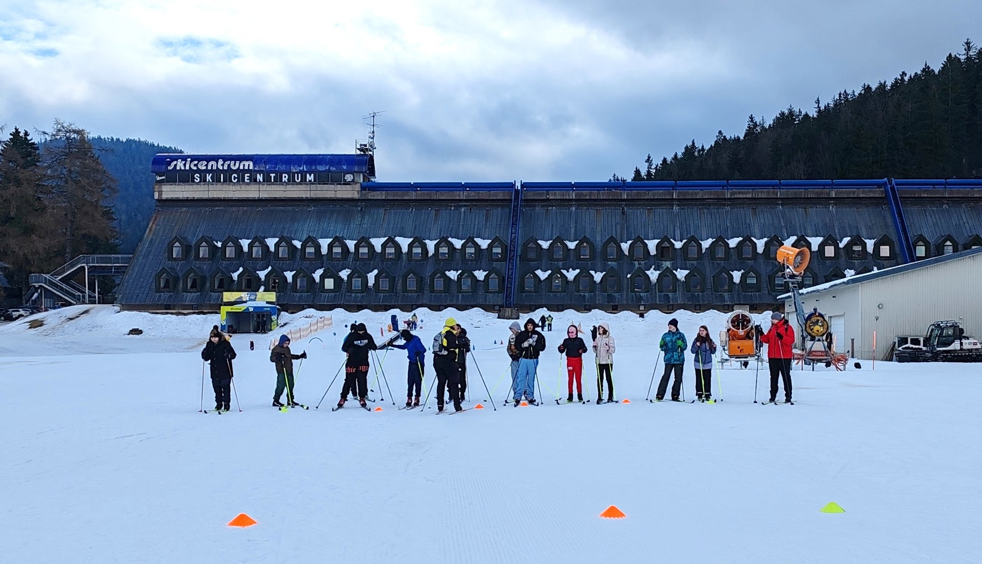 Běžecký stadion nám poskytl ideální zázemí pro zlepšování techniky, zábavné hry i odvážné sjezdy. Náš lyžařský výcvik pokračoval na vyhlášeném běžeckém stadionu v Harrachově. Trénování přímo pod slavnými mamutími můstky má svou nezaměnitelnou atmosféru a podmínky jsou zde pro výuku ideální. Program jsme zahájili trénováním běžecké techniky, kterou jsme prokládali různými hrami na sněhu. Nácvik sjezdů patřil k důležité, ale i zábavné součásti tréninku. Někteří se v rámci tréninku vydali podívat k dojezdu místní sjezdovky, která vede z Čerťáku dolů. Nejzdatnější, kteří po náročném dni měli ještě dostatek sil absolvovali vytyčenou trať na čas. Harrachovský stadion se znovu ukázal jako skvělé místo pro trénování a třeba se sem podíváme zase za rok.