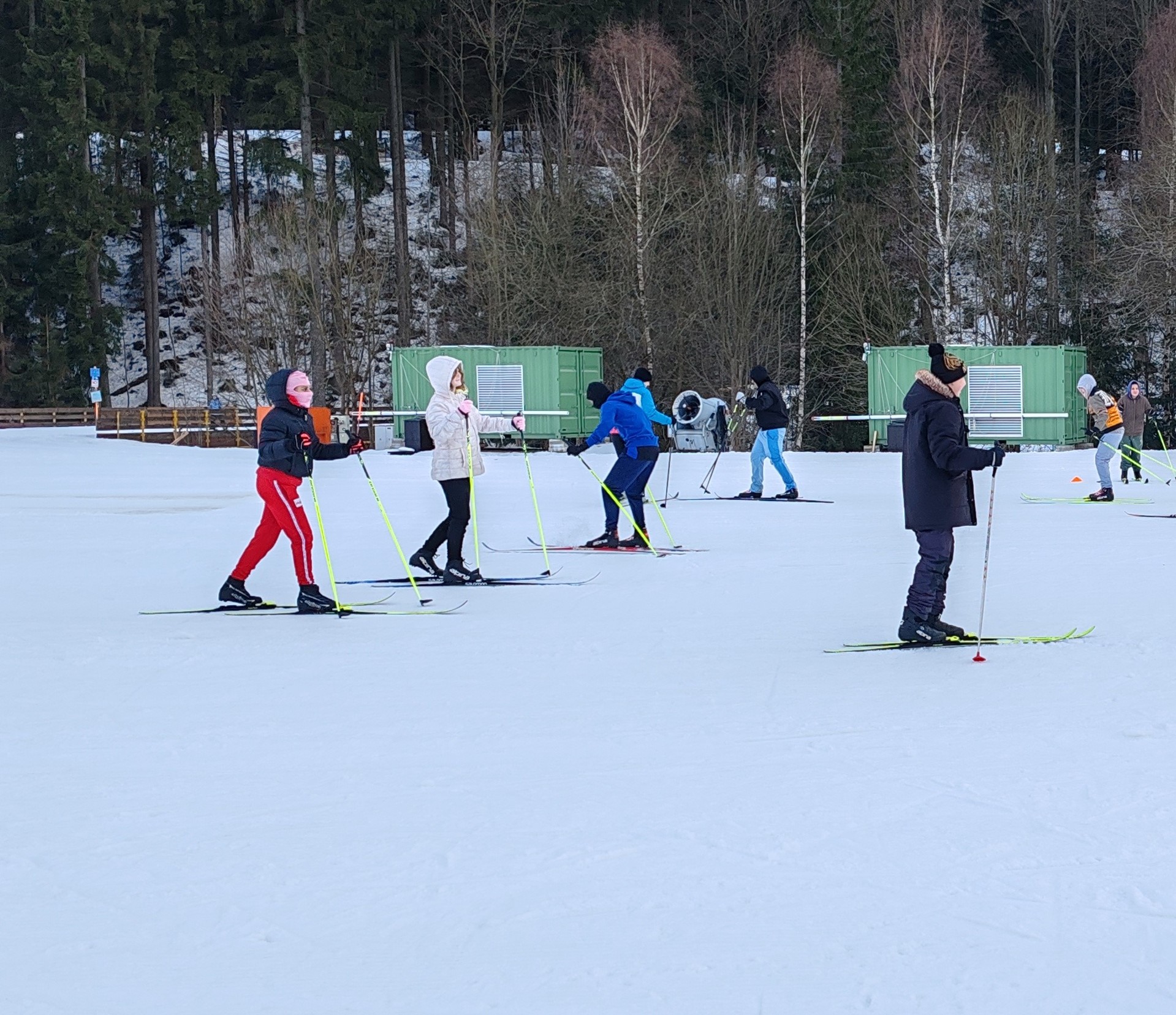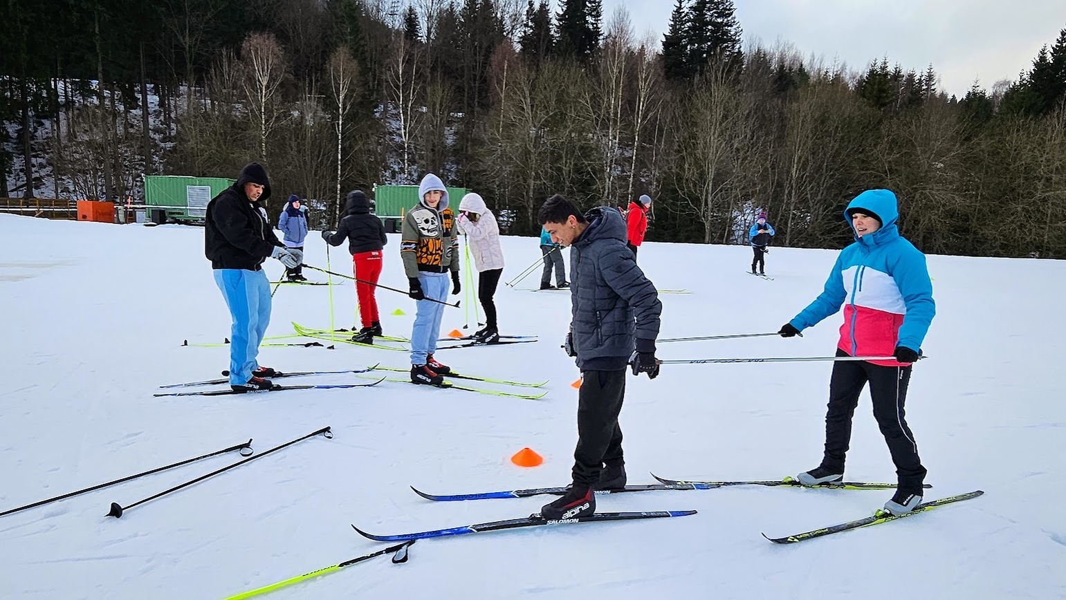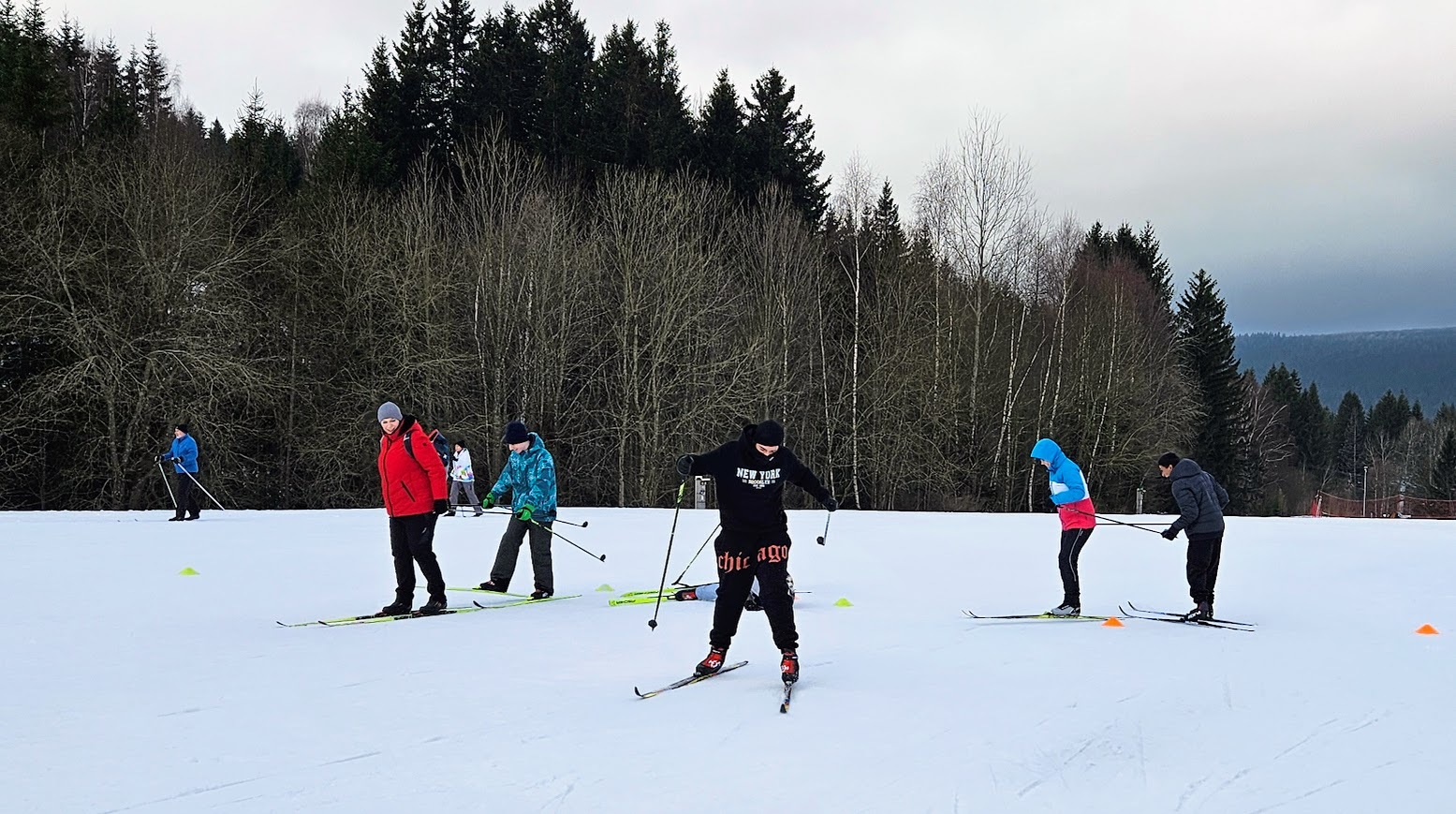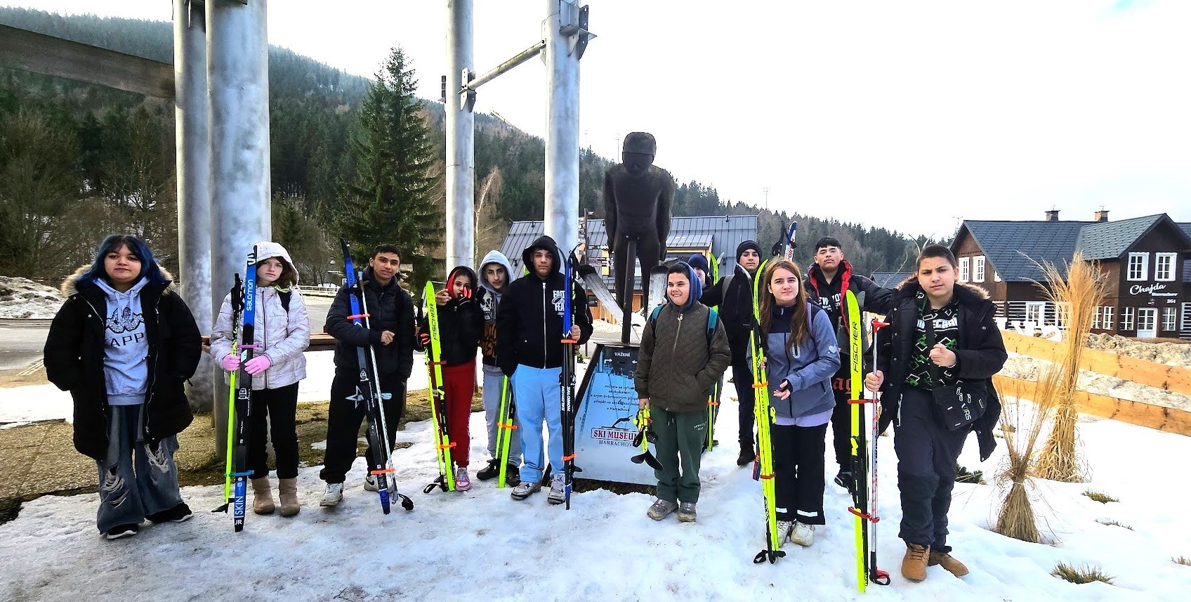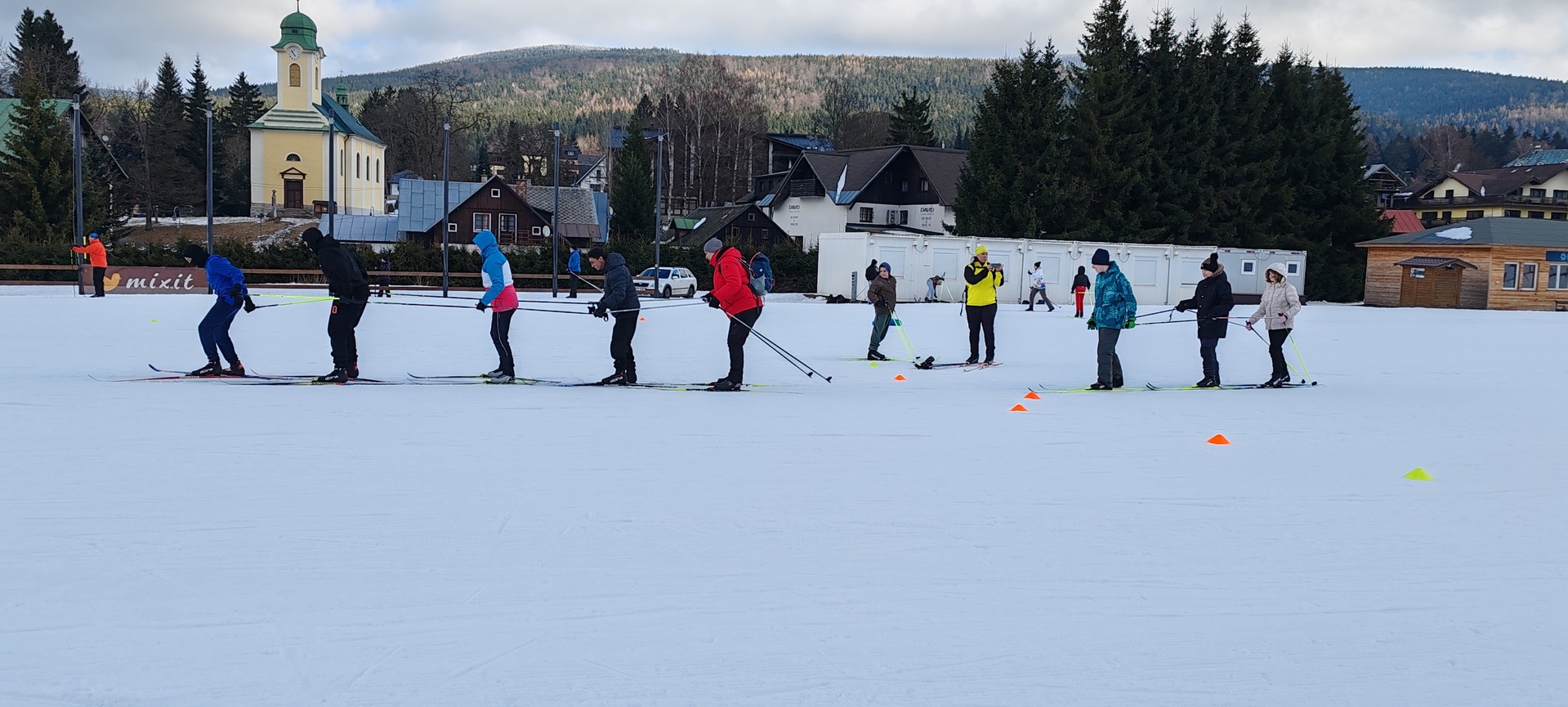 Běžecký stadion nám poskytl ideální zázemí pro zlepšování techniky, zábavné hry i odvážné sjezdy. Náš lyžařský výcvik pokračoval na vyhlášeném běžeckém stadionu v Harrachově. Trénování přímo pod slavnými mamutími můstky má svou nezaměnitelnou atmosféru a podmínky jsou zde pro výuku ideální. Program jsme zahájili trénováním běžecké techniky, kterou jsme prokládali různými hrami na sněhu. Nácvik sjezdů patřil k důležité, ale i zábavné součásti tréninku. Někteří se v rámci tréninku vydali podívat k dojezdu místní sjezdovky, která vede z Čerťáku dolů. Nejzdatnější, kteří po náročném dni měli ještě dostatek sil absolvovali vytyčenou trať na čas. Harrachovský stadion se znovu ukázal jako skvělé místo pro trénování a třeba se sem podíváme zase za rok.