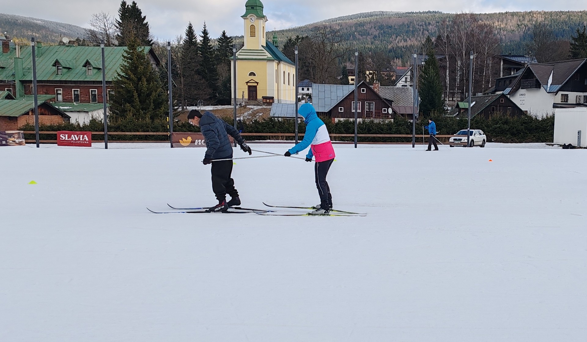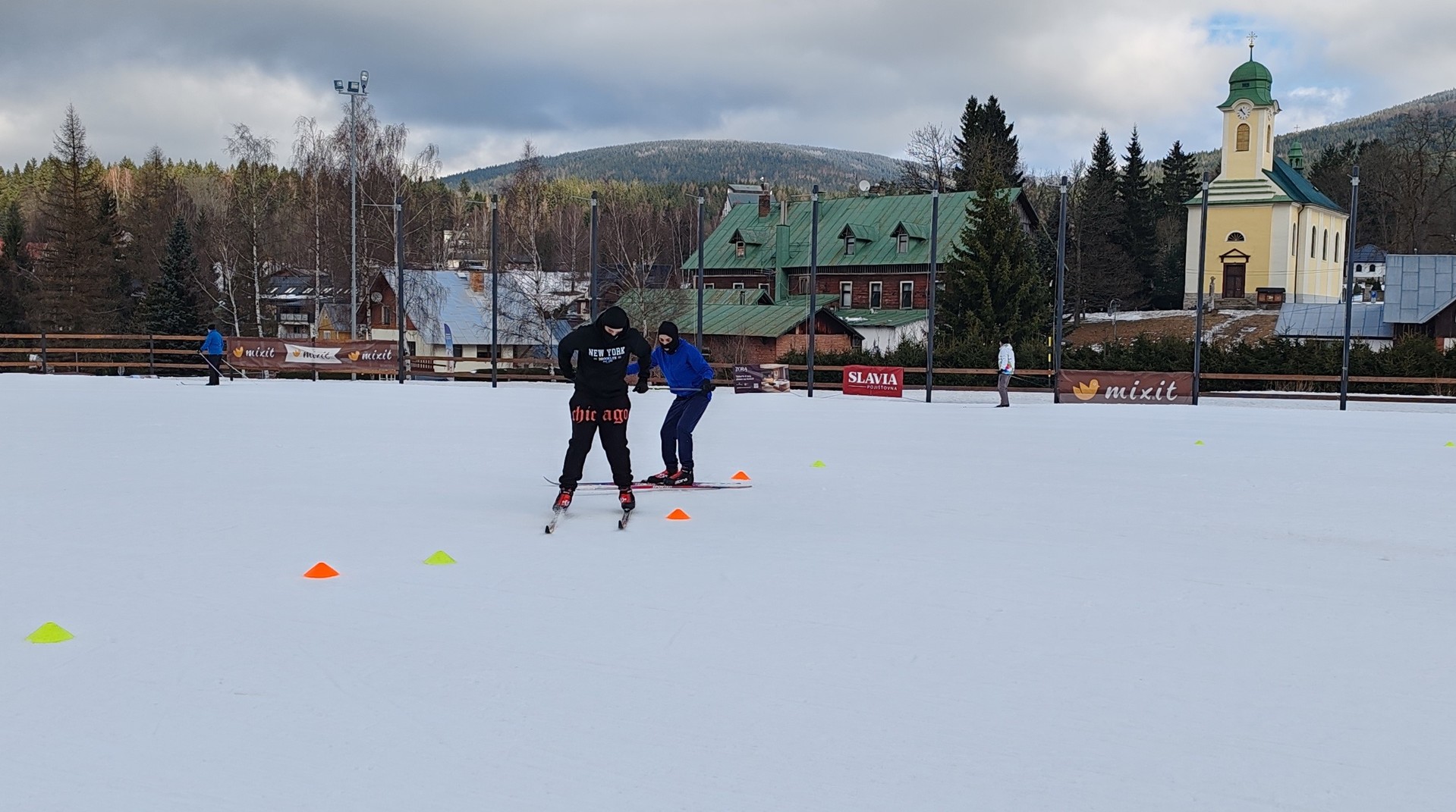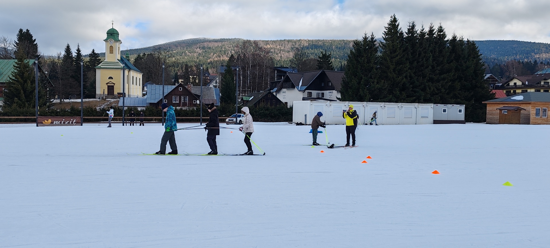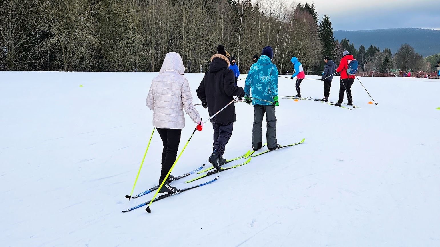 Běžecký stadion nám poskytl ideální zázemí pro zlepšování techniky, zábavné hry i odvážné sjezdy. Náš lyžařský výcvik pokračoval na vyhlášeném běžeckém stadionu v Harrachově. Trénování přímo pod slavnými mamutími můstky má svou nezaměnitelnou atmosféru a podmínky jsou zde pro výuku ideální. Program jsme zahájili trénováním běžecké techniky, kterou jsme prokládali různými hrami na sněhu. Nácvik sjezdů patřil k důležité, ale i zábavné součásti tréninku. Někteří se v rámci tréninku vydali podívat k dojezdu místní sjezdovky, která vede z Čerťáku dolů. Nejzdatnější, kteří po náročném dni měli ještě dostatek sil absolvovali vytyčenou trať na čas. Harrachovský stadion se znovu ukázal jako skvělé místo pro trénování a třeba se sem podíváme zase za rok.